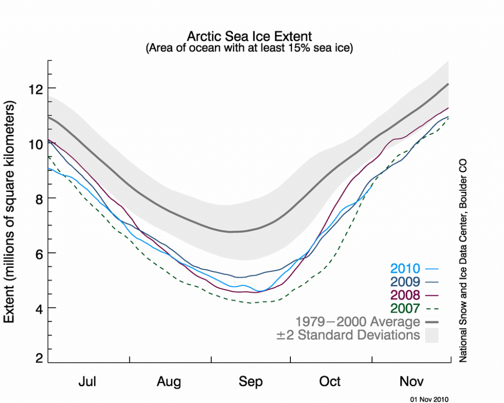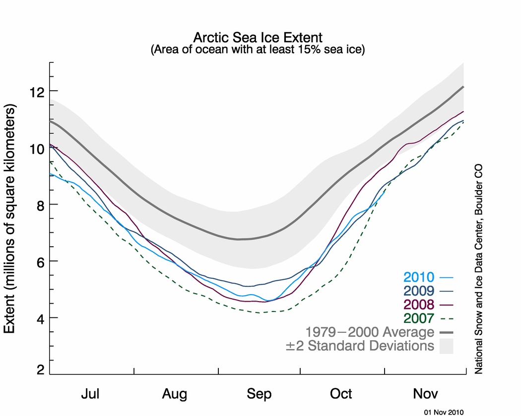 Meðal hafísútbreiðslan í október 2010 var það þriðja lægsat frá því gervihnattamælingar hófust, eða 7,69 milljón ferkílómetrar. Það er 1,60 milljón ferkílómetrum undir meðaltalinu fyrir árin 1979 til 2000 fyrir októbermánuð, en 920.000 ferkílómetrum fyrir lægstu mælinguna sem var í október 2007.