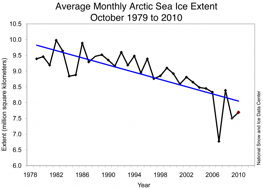 Þrátt fyrir mikin vaxtarhraða í byrjun mánaðarins, þá er október 2010 með þriðju lægstu hafísútbreiðsluna síðan gervihnattamælingar hófust. Línuleg neikvæð leitni fyrir október jókst lítilega, frá -5,9% á áratug í -6,2% á áratug fyrir leitnina í hafísnum.