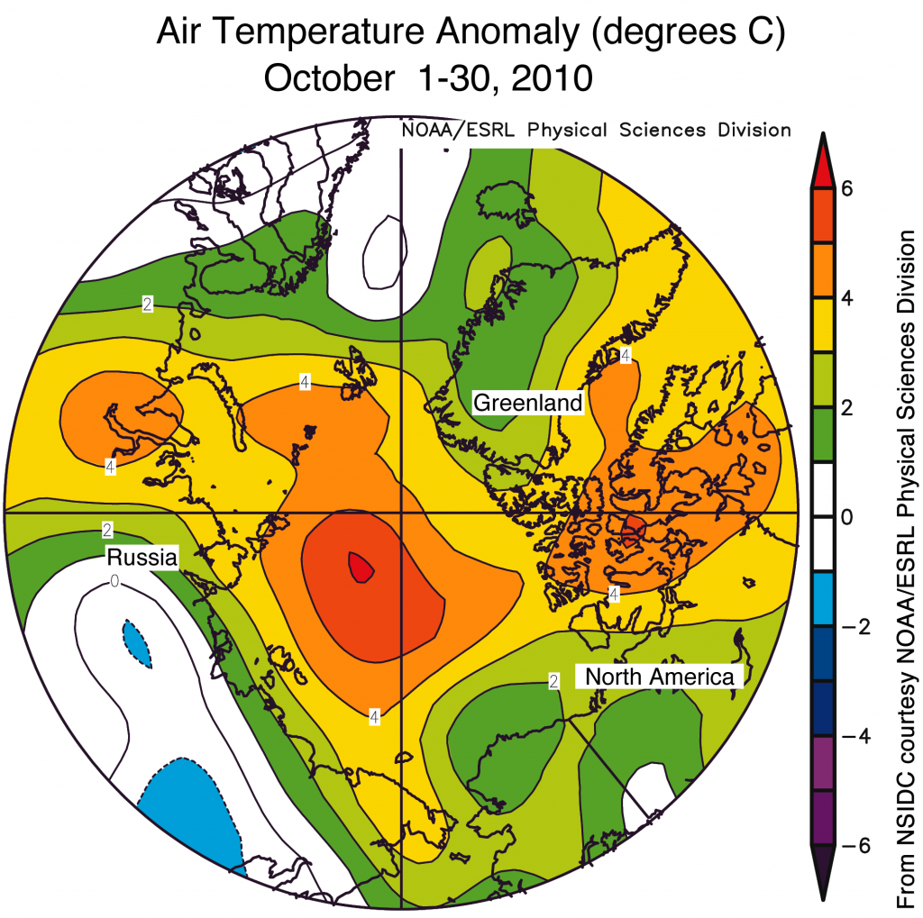 Á meðan lofthiti í október er vel undir frostmarki víðast hvar á Norðurskautinu í október, þá var hitastigið þó um 4 til 6 gráðum celsius hærra en venjulega í nýliðnum októbermánuði.