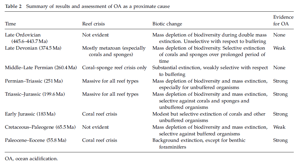Hér er farið yfir atburði í jarðsögunni og tengsl þeirra við ástand kóralrifja og líkur á því að súrnun sjávar hafi átt sér stað.