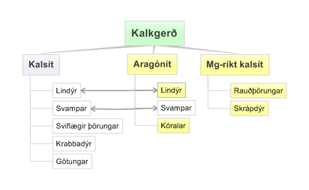Kalkmyndandi lífverur mynda aðallega tvær kristalgerðir kalks (CaCO3), kalsít og aragónít, sem hafa ólíka eðliseiginleika. Aragónít er uppleysanlegra en kalsít og því er mettun kalsíts ávalt hærri en aragóníts í sjónum. Auk kalsíts og aragóníts er stundum rætt um magnesíum-ríkt kalsít sem þriðju kalkgerðina sem lífverur mynda, þá er hátt hlutfall af magnesíum á móti kalsíum (MgCO3/CaCO3) í kalsít kristalgerðinni. Á svipaðan hátt og aragónít, er magnesíumríkt kalsít (Mg-kalsít) uppleysanlegra en kalsít. Þetta leiðir af sér að þegar sýrustig (pH) sjávarins lækkar verður hann undirmettaður m.t.t. aragóníts og Mg-kalsíts nokkru áður en hann verður undirmettaður m.t.t. kalsíts.  Þess vegna eru þær lífverur sem mynda aragónít (t.d. lindýr og kóralar) og Mg-kalsít (t.d. skrápdýr og rauðþörungar) taldar viðkvæmari fyrir súrnun sjávar heldur en lífverur sem mynda kalsít. Á myndinni hér til hliðar má sjá hvaða kalktegundir helstu lífveruhópar mynda. Þær lífverur sem eru taldar í mestri áhættu vegna súrnun sjávar eru merktar með gulum lit.