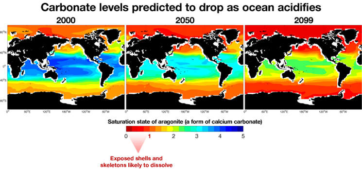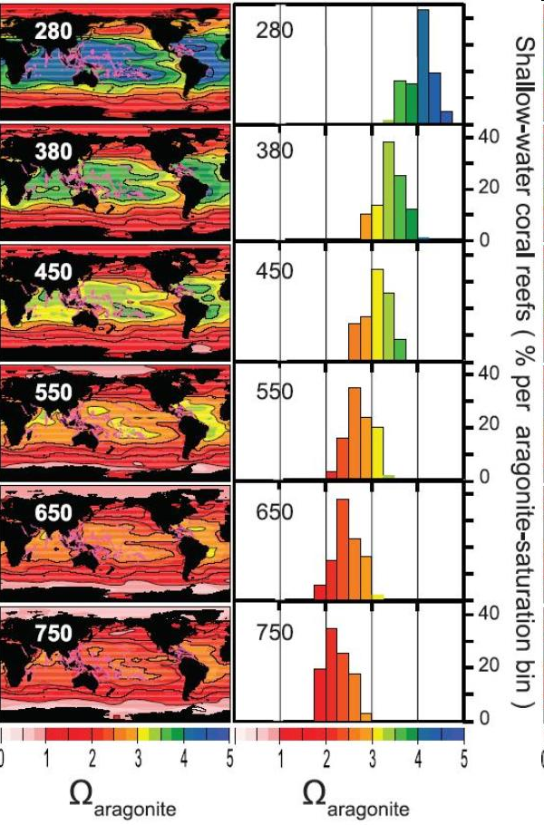 Hlutþrýstingur CO2 hefur þegar hækkað úr 280 ppm fyrir iðnvæðingu í 380 ppm í andrúmslofti og mun líklega ná 550-750 ppm á þessari öld. Mettun aragóníts hefur þegar lækkað frá iðnvæðngu og mun lækka enn frekar á þessari öld. Hlýsjávarkórala er helst að finna þar sem aragónítmettun er hærri en þrír. (Cho & Caldeira, 2008).