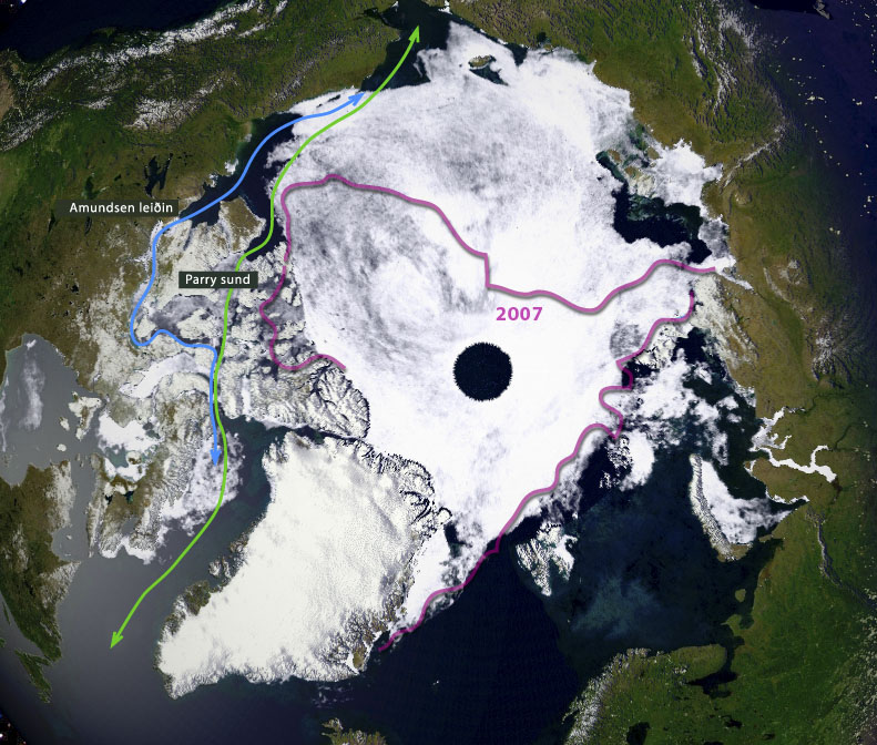 Í síðasta pistli hálfpartinn lofaði ég óvenjumikilli bráðnun á heimskautasvæðunum norður af Kanada, aðallega þá vegna þess hversu hlýtt var á þeim slóðum síðasta vetur. Mér finnst enginn ástæða til að bakka með þá spádóma. Forvitnilegt verður að sjá hvort fær siglingaleið muni opnast að þessu sinni um hið breiða Parry sund eins og gerðist í fyrsta almennilega sinn svo vitað sé árið 2007. Skipum hafði að vísu fyrir þann tíma tekist að sigla þar einstaka sinnum í gegn með herkjum, gjarnan þá með aðstoð ísbrjóta. Það kæmi mér allavega ekkert á óvart að þarna galopnist allt í haust. Önnur leið sem er mun þrengi og oftar opin liggur sunnar þar sem Amundsen tókst fyrstum manna að sigla í gegn á árunum 1903-1906.