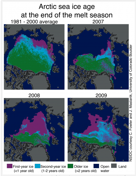 Nú er það svo að mjög margir þættir spila inn í varðandi sumarafkomu heimskautaíssins og kannski ekki furða þó spádómar séu misvísandi og sennilega bara tilviljun hvað af þeim rætist. Almennt virðast flestir spá því að lágmarkið í haust verði í stíl við það sem verið hefur 2 síðustu ár og að lágmarksmetið frá því 2007 verði ekki slegið að þessu sinni. Í þeim spádómum er t.d. horft til þróunar á aldursamsetningu íssins. Mjög lítið er eftir að gömlum lífseigum ís miðað við það sem var fyrir aldamót. Á móti kemur að hinn viðkvæmi fyrsta árs ís er þó ekki eins áberandi og verið hefur allra síðust ár og hlutfall 1-3ja ára íss hefur aukist sem bendir til einhvers endurbata á heimskautaísnum eftir nokkuð öflug vetrarhámörk síðustu 3 ár. Eftir því sem líður á sumarið verða spárnar auðvitað nákvæmari, ef til vill mun hinn mikla bráðnun í þessum mánuði fá einhverja til að endurskoða varfærnislegar spár sínar.